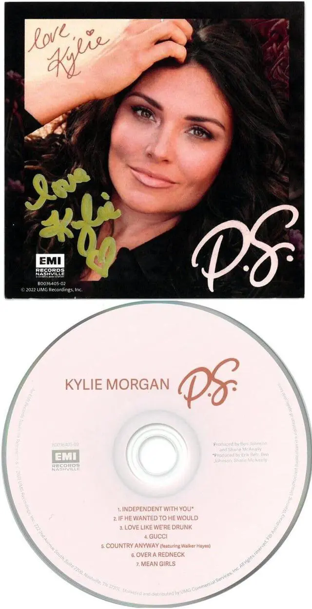 EMI Records Nashville singer/songwriter Kylie Morgan has just released her 2022 P. S. EP Album Cover Booklet & CD with a hand signed 3x4 Art Card. With each track telling a chapter of her story, Kylie co-penned all seven songs, produced by Shane McAnally and Ben Johnson. She opens up about the new project - a continuation of her debut EP Love, Kylie - in the official trailer. Brand new, unused, full gold signature on Art Card. Certificate of Authenticity from Athlon Sports Collectibles.