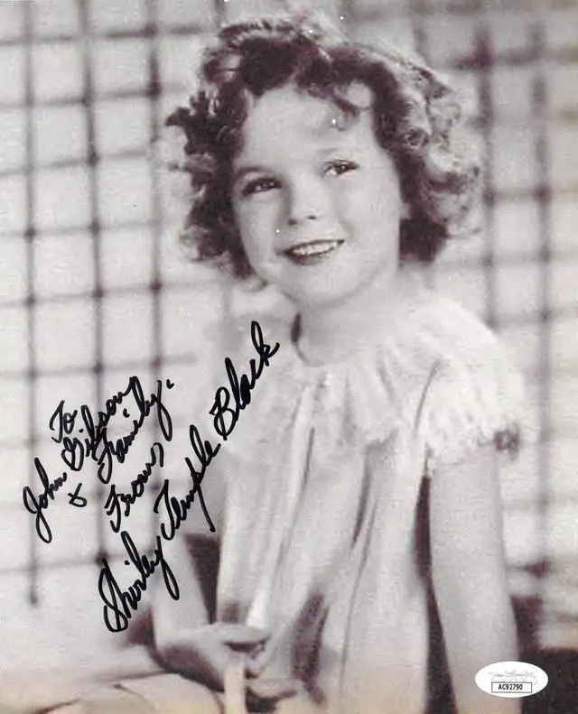 Shirley Temple Black was an American actress, singer, dancer, businesswoman, and diplomat who was Hollywood's number one box-office draw as a child actress from 1935 to 1938. As an adult, she was named United States ambassador to Ghana and to Czechoslovakia, and also served as Chief of Protocol of the United States. Shirley Temple Black has hand signed this Vintage B&W 8X10 Photo with To John Gibson & Family inscription. JSA Authentication #AC92790 and JSA Certificate of Authenticity.