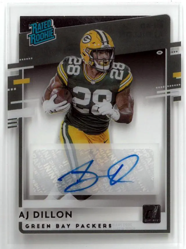 This is an AJ (A. J. ) Dillon signed 2020 Panini Chronicles Donruss Clearly Rated Rookie Auto Card (RC) #RR-AD (Green Bay Packers). Image of actual item instock - as shown.