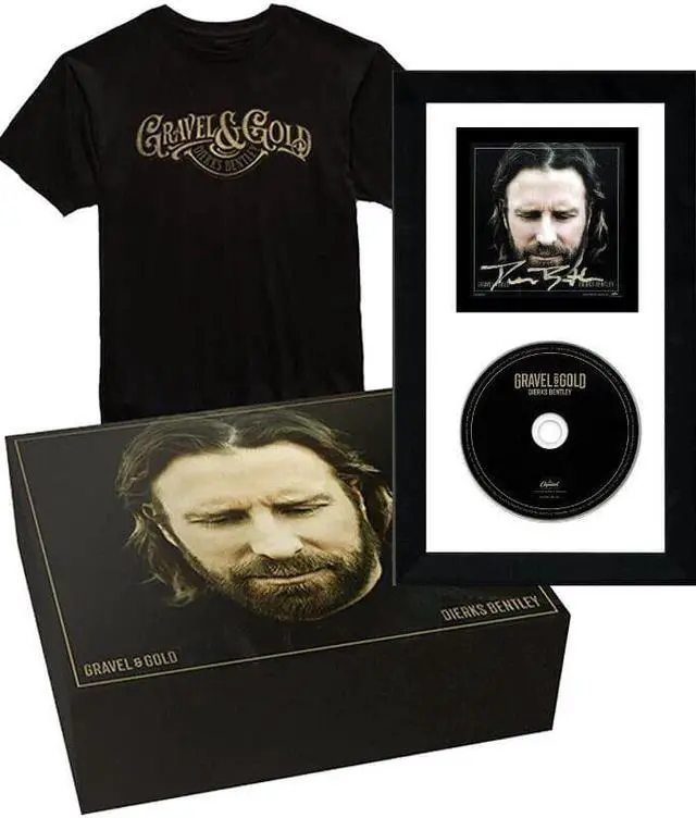 Dierks Bentley JUST released his 10th studio album on Capitol Records Nashville on February 24, 2022. The brand-new album will include 14 songs and features duets with Ashley McBryde and Billy Strings. His latest hit single, "Gold, " is currently rising on the Country charts. Dierks has sold over 10M albums worldwide and garnered over 4.2B streams. He has 21 #1 songs, 3 CMA Awards, 14 GRAMMY nominations and is a member of the Grand Ole Opry. Bold full gold signature. Dierks Bentley has hand Signed this 2023 Gravel And Gold 4x4 Art Card, Album Cover Booklet/CD w/ case - and Gravel & Gold T-Shirt (Size Medium) in Exclusive Box.