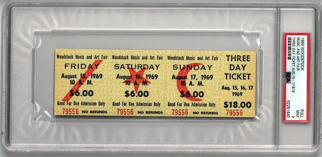 Woodstock was a music festival held between August 1518, 1969, which attracted an audience of more than 400, 000. It is widely regarded as a pivotal moment in popular music history, as well as the definitive nexus for the larger counterculture generation. This is a 1969 Woodstock Music & Art Fair RARE ADVANCE PURCHASE Original Vintage 3 Day $18 Full Ticket Aug 15-17, 1969. PSA Slabbed and Graded Mint 9 62261440. Image of actual item in stock - as shown. Woodstock 3 Day Advanced Tickets. These are by far the rarest of the Woodstock tickets.
