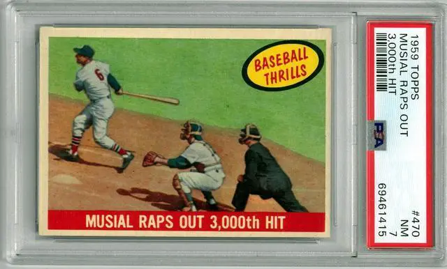This is a Stan Musial 1959 Topps Raps Out 3000th Hit Baseball Card #470- PSA Graded 7 NM (St. Louis Cardinals). Image of actual item instock - as shown. New PSA Label-Graded February 2023
