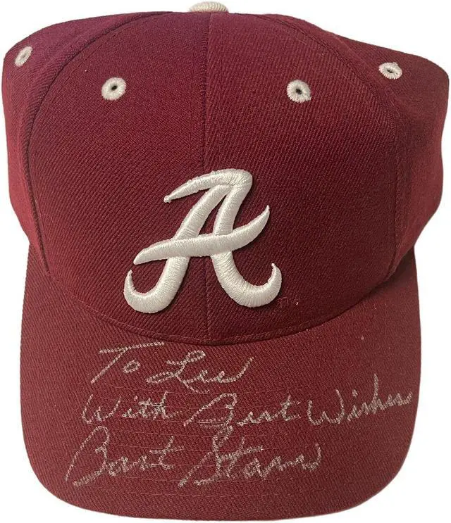 Bart Starr was an incredible quarterback for the Green Bay Packers. Bart Starr was selected as the MVP as he led the Packers to back-to-back wins in Super Bowl I & II. He was elected to 4 Pro Bowls and named league MVP in 1966. While coaching the Packers in 1977 Starr was inducted into the Pro Football Hall of Fame. Bart Starr has hand signed this Official Puma Alabama Crimson Tide NCAA Licensed Wool Cap with To Lee, With Best Wishes inscription. Bold full silver pristine signature. JSA Authentication #AC92228 and JSA Certificate of Authenticity w/ Beckett Authentication Signature Review Order ID 47677 and Order Item ID 57282