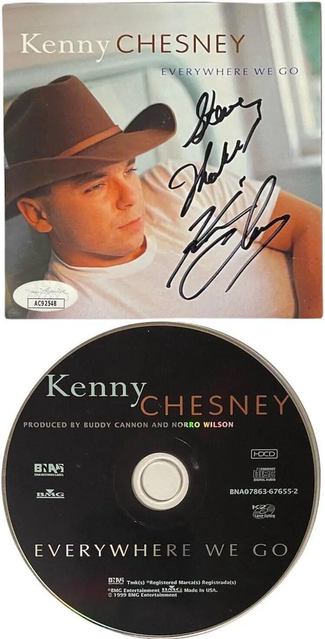 Everywhere We Go is the fifth studio album by American country music singer Kenny Chesney. It was released on March 2, 1999 via BNA Records. The first in his career to be certified double platinum for sales of two million copies, it produced four singles with "How Forever Feels", "You Had Me from Hello", "She Thinks My Tractor's Sexy", and "What I Need to Do". The first two singles were Number One hits on the Billboard country charts. Kenny Chesney has hand signed this 1999 Everywhere We Go BNA Records Album Cover Booklet w/ CD & Case, personalized Thanks Steve.
