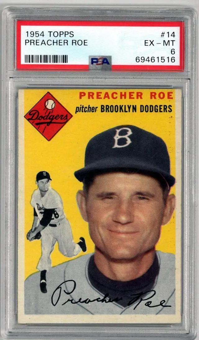 This is a Preacher Roe 1954 Topps Baseball Card #14- PSA Graded 6 EX-MT (Brooklyn Dodgers). Image of actual item instock - as shown. New PSA Label-Graded February 2023