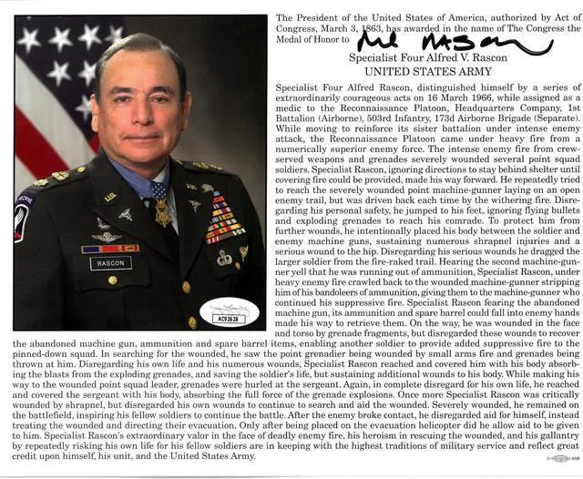Alfred Rascon is a retired United States Army lieutenant colonel. In 2000, he was awarded the Medal of Honorthe United States' highest military decorationfor his actions as a medic near Long Khánh Province during the Vietnam War. On more than one occasion Rascon exposed himself to enemy fire and grenades by covering the bodies of those whom he was aiding with his own. Alfred Rascon has hand signed this Medal of Honor 8x10 Photo. JSA Authentication #AC92628 & JSA Certificate of Authenticity.
