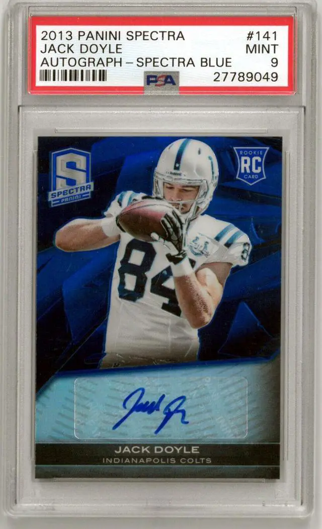 This is a Jack Doyle signed 2013 Panini Sprectra Blue Rookie Auto Card (RC) #141- PSA Graded 9 Mint (Indianapolis Colts). Image of actual item instock - as shown