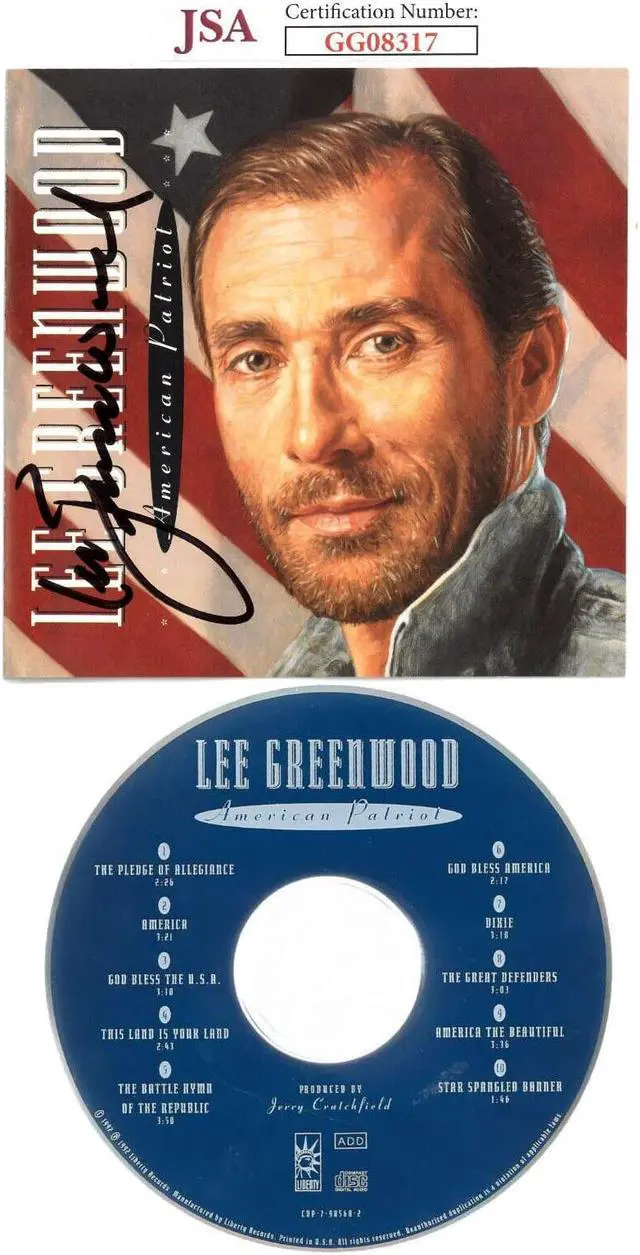 Lee Greenwood is an American country music artist. Active since 1962, he has released more than 20 major-label albums and has charted more than 35 singles on the Billboard country music charts. Greenwood is known for his patriotic signature song "God Bless the U. S. A. " Lee Greenwood has hand signed this 1992 American Patriot Album Cover Booklet w/ CD & Case. JSA Authentication #GG08317 and JSA Certificate of Authenticity for both. Handling/condition as shown.