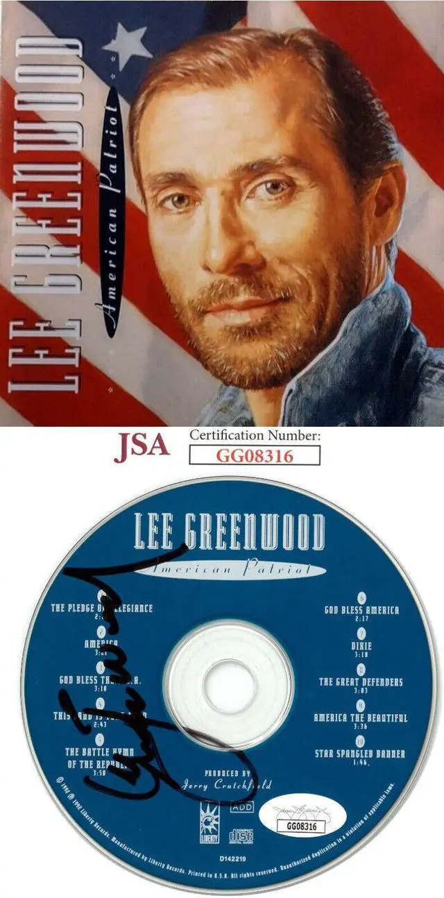 Lee Greenwood is an American country music artist. Active since 1962, he has released more than 20 major-label albums and has charted more than 35 singles on the Billboard country music charts. Greenwood is known for his patriotic signature song "God Bless the U. S. A. " Lee Greenwood has hand signed this 1992 American Patriot Album CD w/ Booklet & Case. JSA Authentication #GG08316 and JSA Certificate of Authenticity for both. Handling/condition as shown.