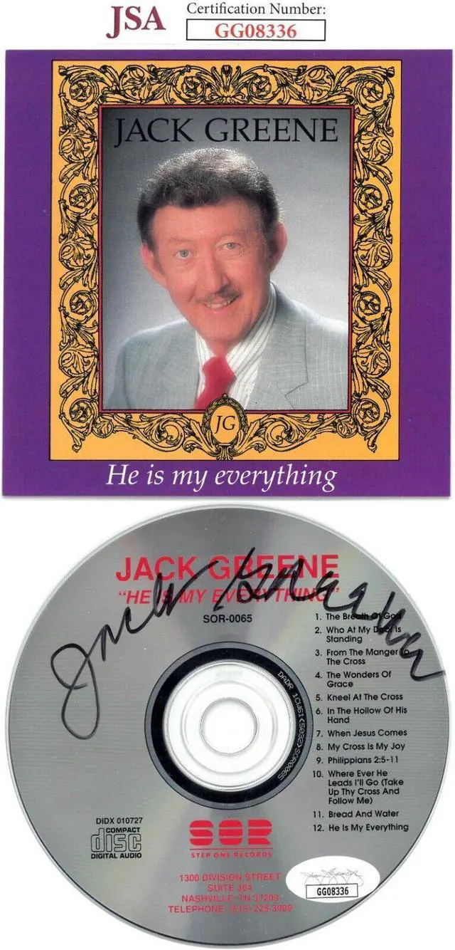 Jack Greene was an American country musician. Nicknamed the "Jolly Greene Giant" due to his height and deep voice, Greene was a long time member of the Grand Ole Opry. A three-time Grammy Award nominee, Greene is best known for his 1966 hit, "There Goes My Everything". Greene had a total of five No. 1 country hits and three others that reached the top ten. Jack Greene has hand signed this 1991 He is my everything CD w/Album Cover & Case. JSA Authentication #GG08336 with JSA Certificate of Authenticity. Handling/condition as shown.