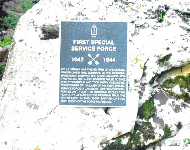 He was able to determine that many injuries were caused because one leg took the full shock of impact. Hope served with the FSSF during their mountain invasion training before leaving to run the Army's Motion Picture School. He later joined the Ninth Army, which fought at the Battle of the Bulge and led the push into Germany and Berlin. Tom Hope has hand signed this WWII Color 8x10 Photo. JSA Authentication #AC928190 & JSA Certificate of Authenticity