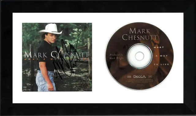 Country Music Association: the Horizon Award (now known as Best New Artist) and Vocal Event of the Year, both in 1993. Mark Chesnutt has hand signed this 1994 What A Way To Live Album Cover Booklet w/ CD & Case. JSA Authentication #GG08248 with JSA Certificate of Authenticity. Handling/condition as shown. Custom White Mat and Black Frame as shown to overall size 6.5 inch x 12 inch