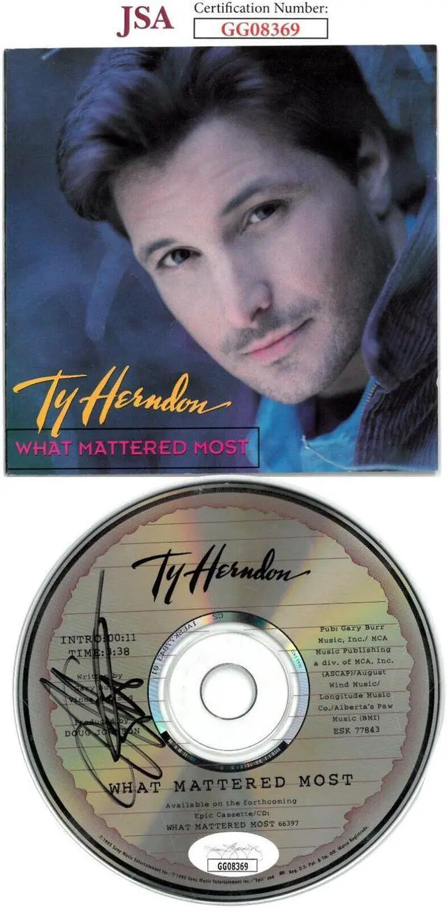 Ty Herndon is an American country music singer and songwriter. His music career began in the 1980s as a member of the Tennessee River Boys, a predecessor to the country band Diamond Rio. Herndon quit the band early on and gained his first national exposure as a competitor on Star Search. His musical style is defined by his singing voice and an emphasis on ballads. Ty Herndon has hand signed this 1995 What Mattered Most Album CD w/Cover Booklet & Case. JSA Authentication #GG08369 with JSA Certificate of Authenticity. Handling/condition as shown.