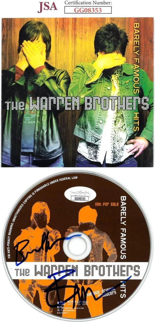 The Warren Brothers are an American country music duo composed of brothers Brett Warren (lead vocals, acoustic guitar, harmonica, mandolin, piano) and Brad Warren (background vocals, acoustic guitar, electric guitar). The duo has released three studio albums and a compilation album. These four albums have produced nine charting singles on the Billboard Hot Country Songs charts. The Warren Brothers-= Brett Warren/Brad Warren have both hand signed this 2005 Barely Famous Hits Album CD w/Cover Booklet & Case. JSA Authentication #GG08353 and JSA Certificate of Authenticity. Handling/condition as shown.