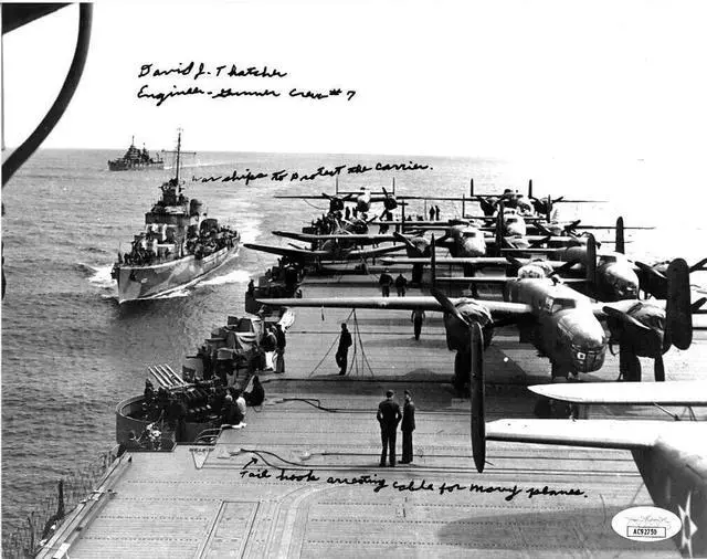 Corporal David J. Thatcher (a flight engineer/gunner on Lawson's crew) was awarded the Silver Star for helping the wounded crew members to evade Japanese troops in China. David Thatcher has hand signed this 8x10 Photo with Engineer- Gunner Crew #7 & ships to protect the carrier and tail hook aresting cable for moving planes inscriptions. JSA Authentication #AC92750 and JSA Certificate of Authenticity.