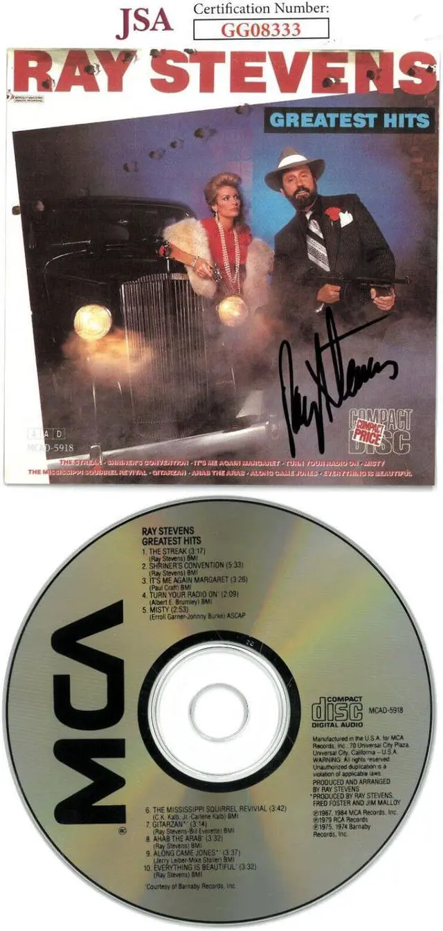 Ray Stevens, is an American country and pop singer-songwriter and comedian, known for his Grammy-winning recordings "Everything Is Beautiful" and "Misty", as well as comedic hits such as "Gitarzan" and "The Streak". He has been inducted into the Nashville Songwriters Hall of Fame, the Georgia Music Hall of Fame, and the Christian Music Hall of Fame; and received gold albums for his music sales. In 2019, he was inducted into the Country Music Hall of Fame and Museum. Ray Stevens has hand signed this 1987 Greatest Hits Album Cover Booklet w/CD & Case.