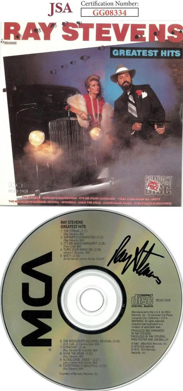 Ray Stevens, is an American country and pop singer-songwriter and comedian, known for his Grammy-winning recordings "Everything Is Beautiful" and "Misty", as well as comedic hits such as "Gitarzan" and "The Streak". He has been inducted into the Nashville Songwriters Hall of Fame, the Georgia Music Hall of Fame, and the Christian Music Hall of Fame; and received gold albums for his music sales. In 2019, he was inducted into the Country Music Hall of Fame and Museum. Ray Stevens has hand signed this 1987 Greatest Hits Album CD w/Cover Booklet & Case.