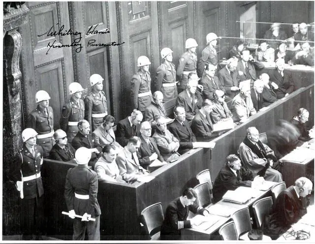 For his work in the Nuremberg trials, Harris was decorated with the Legion of Merit. Whitney Harris has hand signed this 1945-46 WWll Nuremberg Trials Vintage B&W 8.5 x11 photo, pristine black full signature with Nuremberg Prosecutor inscription. Global/GAI Authentication #GV546116 and Global Authentication Card with PSA Authentication #AD55335 and Certificate Of Authenticity from Athlon Sports Collectibles. Very rare signature