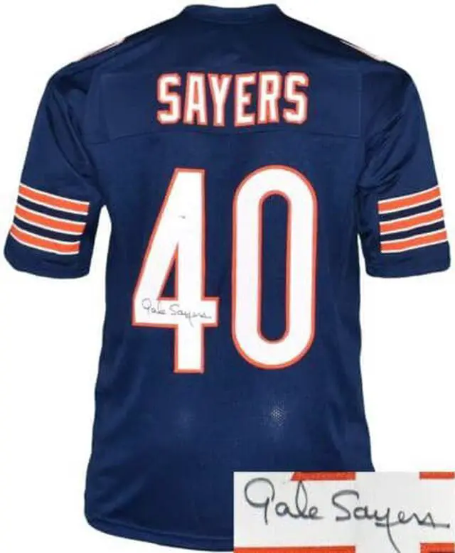 This is a new, in stock, Gale Sayers signed Chicago Navy Throwback unlicensed Custom Stitched Pro Style Football Jersey #72 with fully stitched twill numbers on the front and back and players name plate, there are NO LOGOS, TAGS, BRAND NAMES or PATCHES ON THIS JERSEY & IS NOT AN AUTHENTIC OFFICIALLY LICENSED NFL JERSEY, 100% polyester, made in the Philippines. Size XL (48/50). PSA Authentication and PSA Certificate of Authenticity.