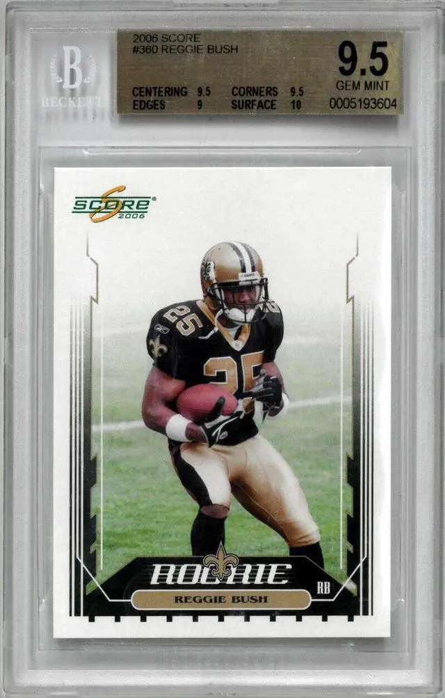 This is a Reggie Bush 2006 Score Football Rookie Card (RC) #360- Beckett/BGS Graded 9.5 Gem Mint (New Orleans Saints). Image of actual item instock - as shown.