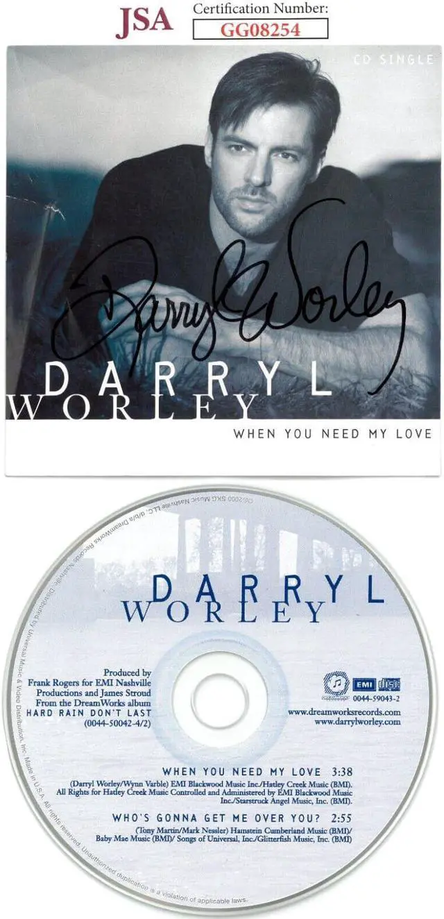 Darryl Worley is an American country music singer and songwriter. Worley's six albums have produced 18 singles on the Billboard Hot Country Songs charts, including three number ones. Nine other singles have reached the top 40. Darryl Worley has hand signed this 2000 When You Need My Love Album Cover w/ CD & Case. JSA Authentication #GG08254 and JSA Certificate of Authenticity. Handling/condition as shown. Cover has multiple bends/creases- sold as is, no returns.