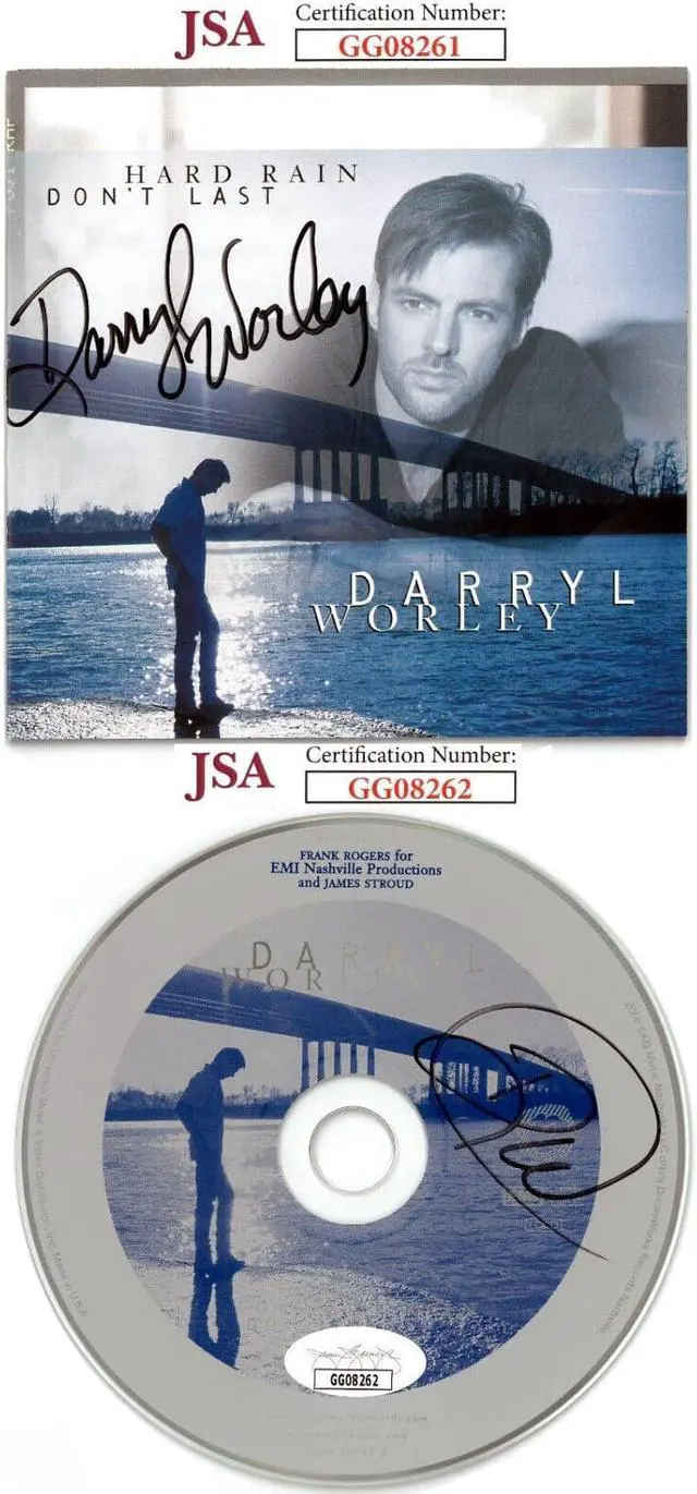 Darryl Worley is an American country music singer and songwriter. Worley's six albums have produced 18 singles on the Billboard Hot Country Songs charts, including three number ones. Nine other singles have reached the top 40. Darryl Worley has hand signed this 2000 Hard Rain Don't Last Album Cover/CD & Case. JSA Authentication #GG08261 on the Album Cover and JSA #GG08262 on the CD. Both with JSA Certificate of Authenticity. Handling/condition as shown.