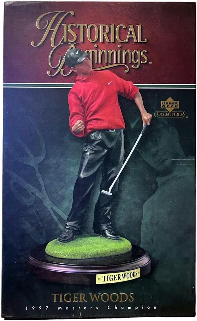 Tiger Woods earned his first green jacket in 1997, beating Tom Kite by 12 strokes while also setting a new course record for combined tournament score of 270. Woods would go on to win the Masters 3 more times (2001, 2002, 2005) The statue stands 11" tall. Fantastic Statue/Figurine Celebrating Tiger Woods win as 1997 Masters Champion with his signature fist pump. He stands 11 high and comes in the original Upper Deck box. Cherry wood base with Nameplate. Excellent-Mint condition. An awesome collectors piece for any sports fan from a legendary PGA Superstar!