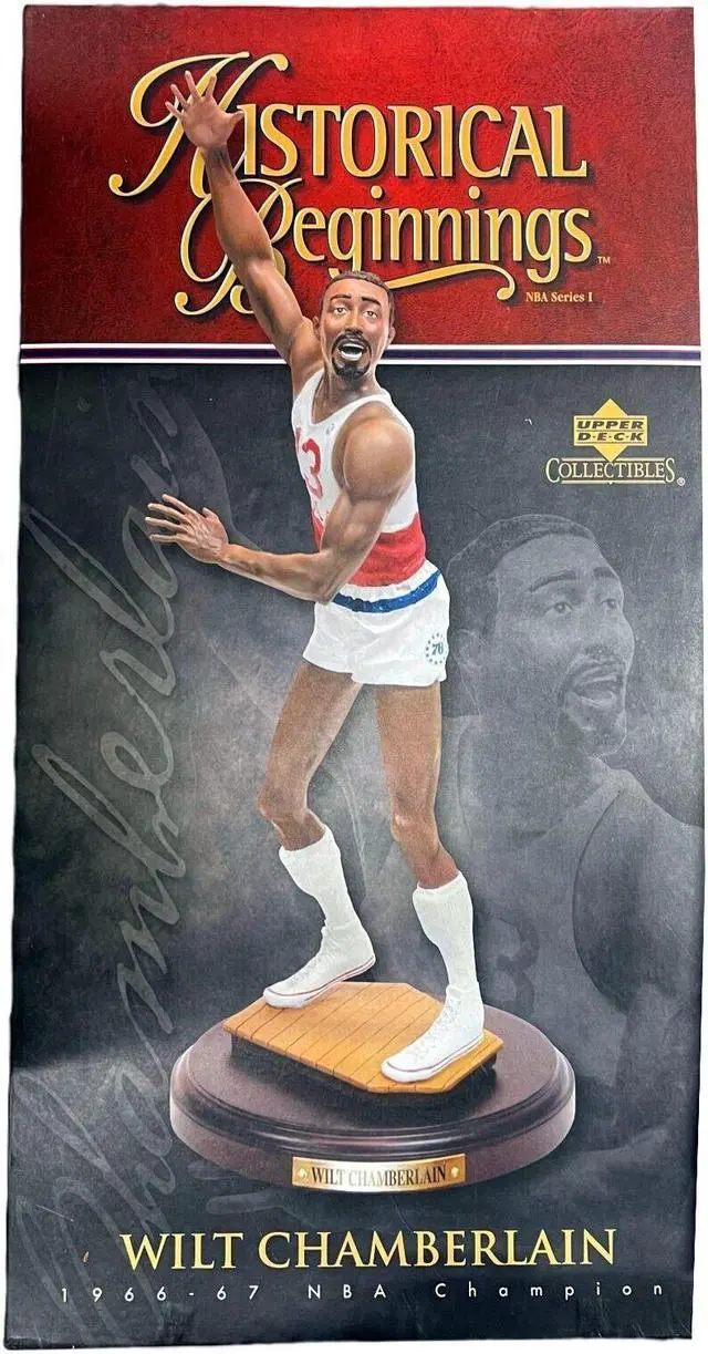 Wilt Chamberlain was inducted into the Basketball Hall of Fame in 1978. Relive Chamberlain's first 1966-67 NBA championship season in the pros with this 10 1/2-inch tall Historical Beginnings statue/figurine. NBA Series 1. Comes in the original Upper Deck box. Cherry wood base with Nameplate. Excellent/Mint condition. An awesome collectors piece for any sports fan from a legendary NBA Superstar!
