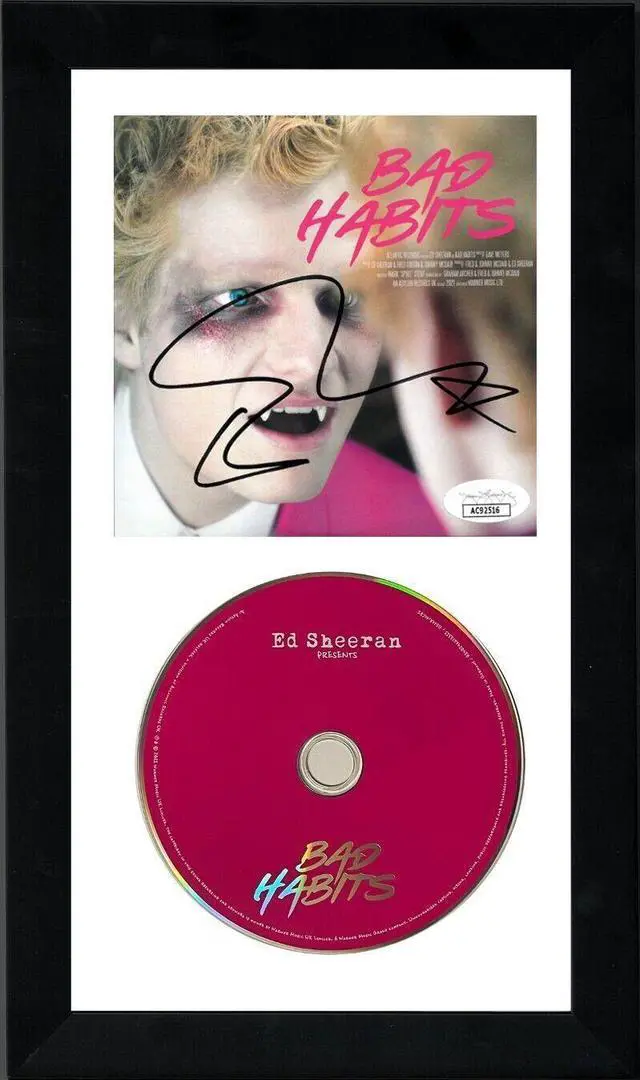 Ed Sheeran announced that his fifth studio album would be called = (pronounced equals) and released on October 29, 2021 with a total of 14 songs including Shivers & Bad Habits. Ed Sheeran has hand signed this 2021 Bad Habits Atlantic Records CD Single Cover w/ CD. JSA Authentication #AC92516 and JSA Certificate of Authenticity. Custom White Mat and Black Frame as shown to overall size 6.5 inch x 12 inch