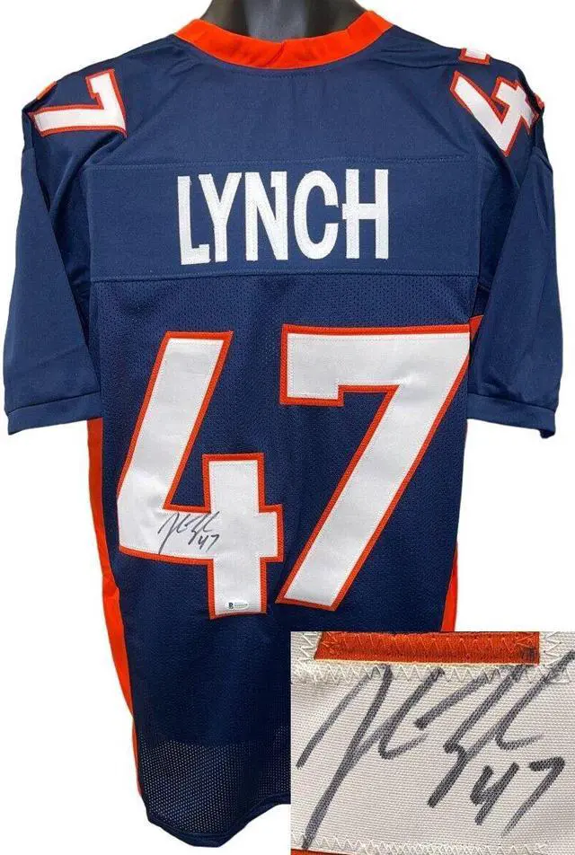 This is a new, in stock, John Lynch signed Denver Navy unlicensed Custom Stitched Pro Style Football Jersey #47 with fully stitched twill numbers on the front and back and players name plate, there are NO LOGOS, TAGS, BRAND NAMES or PATCHES ON THIS JERSEY & IS NOT AN AUTHENTIC OFFICIALLY LICENSED NFL JERSEY, 100% polyester, made in the Philippines. Size XL (48/50). Beckett Witnessed #WH03078 and Certificate of Authenticity. Photo of signing/Denver Autographs Certificate of Authenticity included as well.