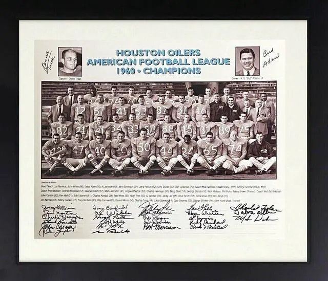 Hand signed signatures: K. S. Bud Adams Jr-owner, Orville Trask-coach, Bill Groman, Charlie Hennigan, Al Jamison, Mark Johnson, Rich Michael, Jim Norton, Charlie Tolar, Jerry Helluin, Dalva Allen, Mike Dukes, Dan Lanphear, Charles Milstead, Hogan Wharton, John Carson, Ken Hall, Bob Talamini, Charles/Chuck Kendall, Bob White, Hugh Pitts, Al Witcher, Tony Banfield + 4. Exceptional full pristine black signatures as shown. New, Custom Framing as shown. Athlon obtained via the Personal Collection from the Late Legendary Bob Hyde Mr. Oiler, Estate. Beckett Authentication Signature Review Order ID: 62449, Order Item ID #75082