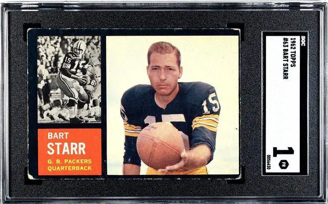 This is a Bart Starr 1962 Topps Card #63- SGC Graded 1 Poor (Green Bay Packers). Image of actual item instock - as shown.