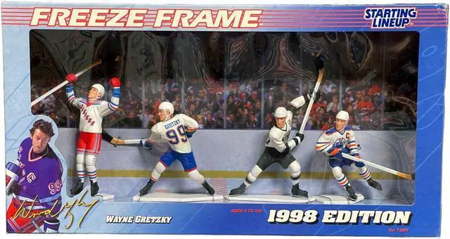 This is a Wayne Gretzky 1998 Starting Line Up Freeze Frame Edition Kenner/Hasbro. Four action figures, Rangers/Kings/Oilers, measuring 4 TO 5 inches high. Brand new never opened. Also includes original factory shipper box. Very, very minor corner dings from storage, as shown.