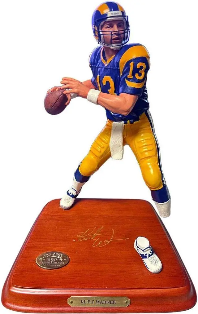 Simply exquisite Kurt Warner St. Louis Rams All Star Football Figurine/Statue. This is an amazingly lifelike sculpture honoring one of the NFL QB SB MVP Greats! This All-Star Figurine series is a commanding centerpiece for any shelf, table, desk or display. Each sculpture is expertly hand-painted to ensure accurate colors, textures and on-the-field details. This is an officially NFL licensed and a Danbury Mint exclusive. Extraordinary detail, meticulously crafted. The sculpture is set on a handsome wood base with an inscribed brass name plaque, inset commemorative medallion, and reproduction of Kurt Warners gold facsimile signature.
