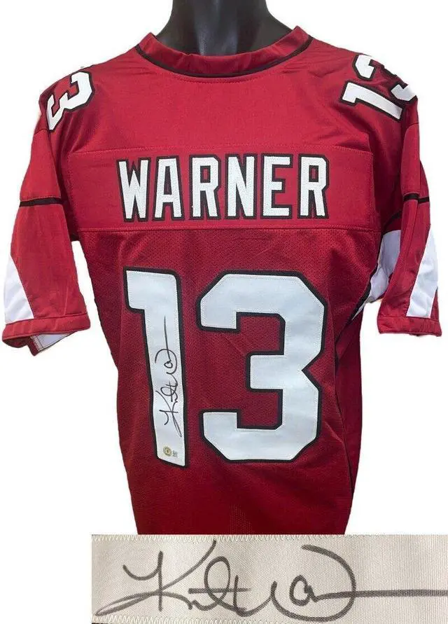 This is a new, in stock, Kurt Warner signed Arizona Cardinal Red unlicensed Custom Stitched Pro Style Football Jersey with fully stitched twill numbers on the front and back and players name plate, there are NO LOGOS, TAGS, BRAND NAMES or PATCHES ON THIS JERSEY & IS NOT AN AUTHENTIC OFFICIALLY LICENSED JERSEY, 100% polyester, made in the Philippines. Size XL (48/50). Beckett Witnessed Authentication Hologram #WL33309 and Beckett Certificate of Authenticity.