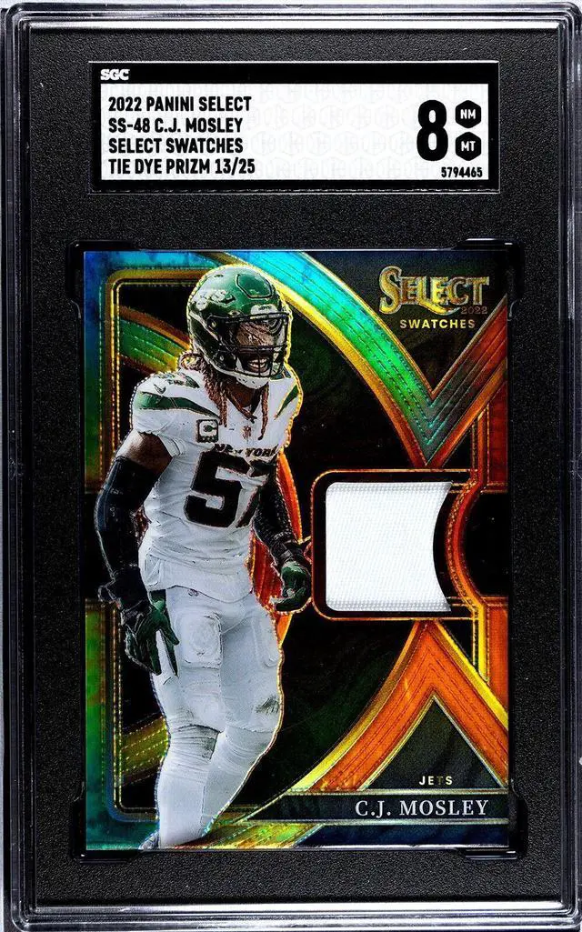 This is a CJ/C. J. Mosley 2022 Panini Select Swatches Tie Dye Prizm Card #SS-48- 13/25- SGC Graded 8 NM-MT (New York Jets). Image of actual item instock - as shown.
