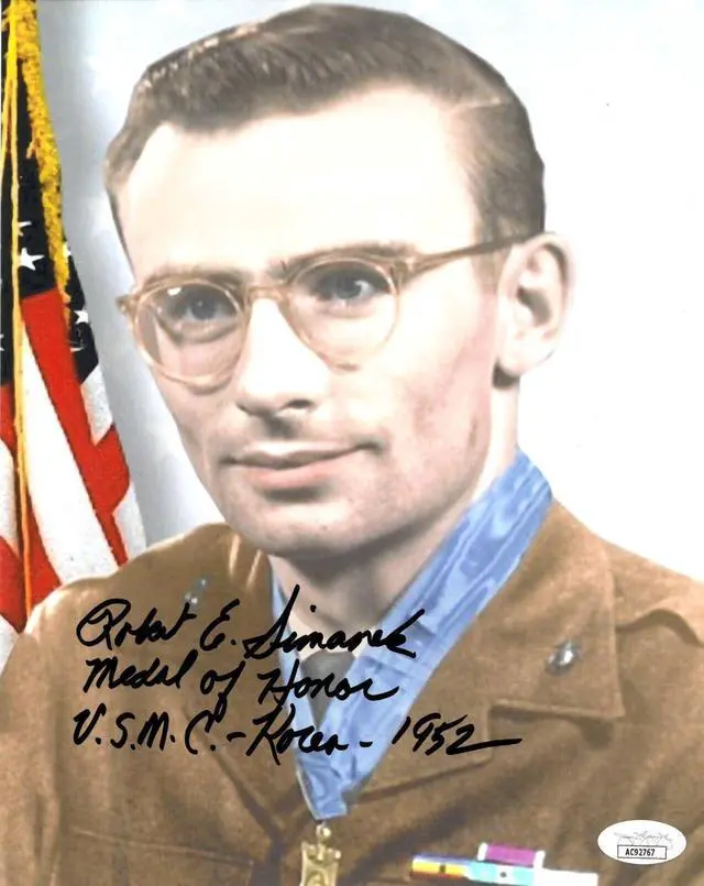 Robert Ernest Simanek (26 April 1930 1 August 2022) [1] was a United States Marine and a recipient of the United States military's highest decoration, the Medal of Honor, for his actions during the Korean War. Robert Simanek has hand signed this Korean War Vintage Color 8x10 Photo with Medal of Honor/USMC Korea 1952 inscription. JSA Authentication #AC92767 and JSA Certificate of Authenticity. Image of actual item instock - as shown.