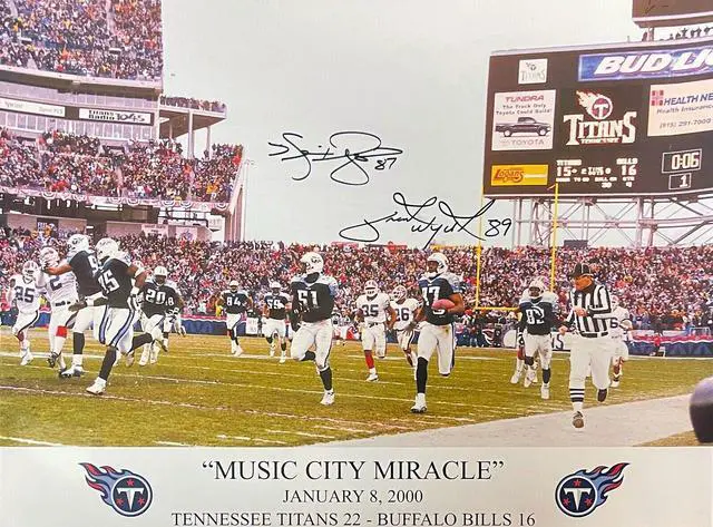 Dyson, as one of the team's lead wide receivers, rarely practiced with the special teams unit and was largely unfamiliar with the layout of the play. Nevertheless, his execution of Lowry's vision was flawless and thus became the "Music City Miracle". This Music City Miracle Rare 20X24 Photo is hand signed by Kevin Dyson and the late Frank Wycheck. Full black signatures, Dyson inscribed #87, Wycheck inscribed # 89. Athlon obtained via the Personal Collection from the Late Legendary Bob Hyde Mr. Oiler, Estate. Beckett Authentication Signature Review Order ID: 65910, Order Item ID #79432.