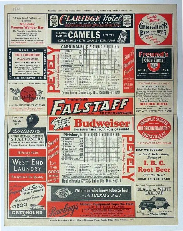 This is a 1941 St. Louis Cardinals/Pittsburgh Pirates Sportsman Park 11.25 x 14.25 Official 5 Cent Score Card. Sunday, August 10,
