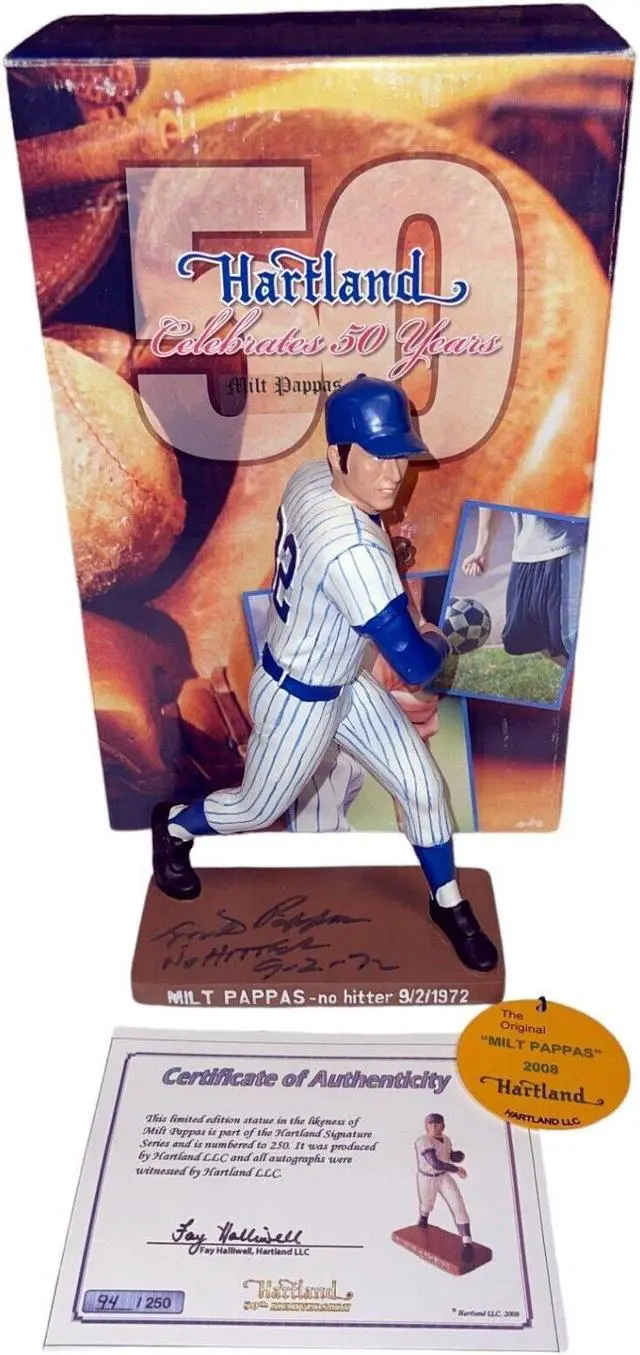 Milton Steven Pappas was an American professional baseball player. He played in Major League Baseball as a right-handed pitcher from 1957 through 1973. Nicknamed "Gimpy", the 17-year veteran pitched for the Baltimore Orioles (19571965), Cincinnati Reds (19661968), Atlanta Braves (19681970) and Chicago Cubs (19701973). This is a very rare Milt Pappas hand signed Chicago Cubs #32 Uniform, Hartland 7.5 Statue/Figurine Signature Series. Bold black pristine base top signature.. Inscribed NO HITTER 9-2-72. Ltd edition and numbered 94 of /250. Original Mint packaging, mint figure molded plastic encased, figure and original #d Hangtag AND Certificate Of Authenticity are also pristine.