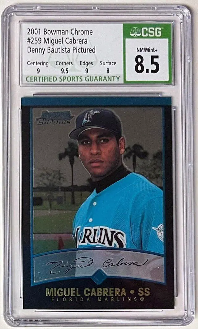 This is a Miguel Cabrera 2001 Bowman Chrome Rookie Error Card (RC) #259 (Denny Bautista Pictured) - CSG Graded 8.5 NM-MT+ (Florida Marlins). Image of actual item instock - as shown.