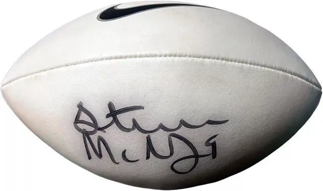 Stephen LaTreal McNair nicknamed "Air McNair", was an American football quarterback who played in the National Football League (NFL) for 13 seasons. He started his first two seasons with the Houston Oilers before the team relocated to Nashville, Tennessee. There, McNair would become the first franchise quarterback of the Tennessee Titans. He also played for two seasons with the Baltimore Ravens. Steve McNair has Hand Signed this Nike Logo Full Size White Panel Football. Full black signature, inscribed 9, panel below Nike Logo. Beckett Authentication Signature Review Order ID: 71616, Order Item ID #86277.