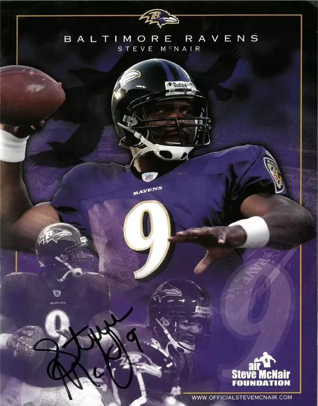 Stephen LaTreal McNair nicknamed "Air McNair", was an American football quarterback who played in the National Football League (NFL) for 13 seasons. He started his first two seasons with the Houston Oilers before the team relocated to Nashville, Tennessee. There, McNair would become the first franchise quarterback of the Tennessee Titans. He also played for two seasons with the Baltimore Raven. Steve McNair Has Hand Signed This Baltimore Ravens Air McNair Foundation Licensed NFL Collage 8.5 x11 Photo. Bold full black pristine signature, Inscribed 9. Beckett Authentication Signature Review Order ID: 71616, Order Item ID #86282