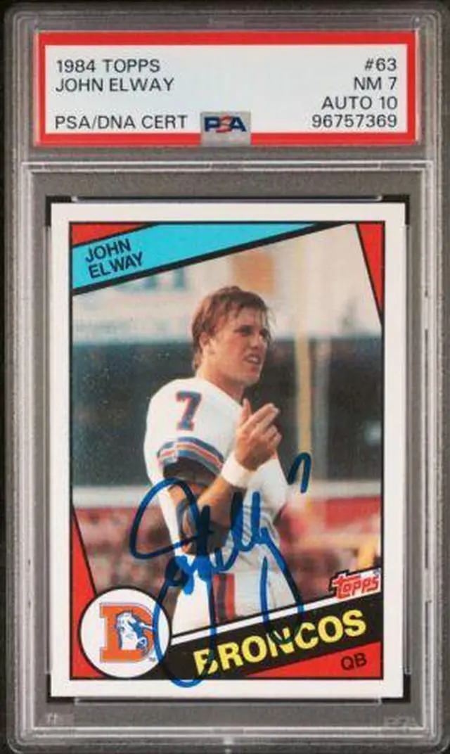 John Elway signed 1984 Topps Rookie On Card Auto (RC) #63- PSA Graded 7 NM/Autograph 10 (Denver Broncos)