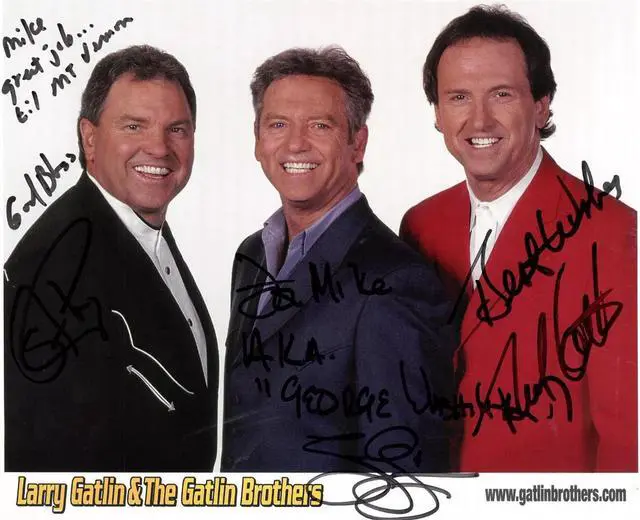 Larry Wayne Gatlin is an American country and Southern gospel singer-songwriter. As part of the Gatlin Brothers trio that included his younger brothers Steve and Rudy, he achieved considerable success within the country music genre, performing on 33 top 40 country singles, a total inclusive of his recordings as a solo artist and with the group. The Gatlin Brothers, Larry, Steve, and Rudy have hand signed this 8x10 Color promo photo. Full black signatures (3), personalized To Mike, inscribed God Bless, Best Wishes, Great Job, etc.