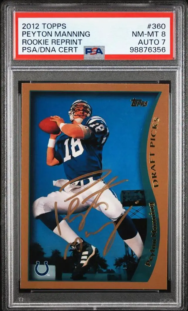 This is a Peyton Manning signed 2012 Topps Rookie Reprint On Card Auto #360- PSA Graded 8 NM-MT/Autograph 7 (Colts/HOF). Image of actual item in stock - as shown.