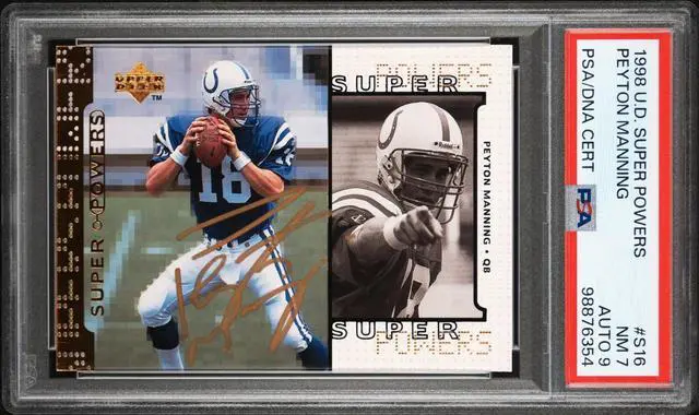 Peyton Manning signed 1998 Upper Deck Super Powers Rookie On Card Auto (RC) #S16- PSA Graded 7 NM/Autograph 9 (Colts/HOF)