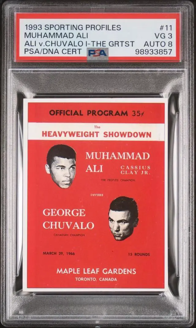This is a 1993 Sporting Profiles The Greatest - #11 Muhammad Ali (SIGNED), George Chuvalo PSA VG 3/ Auto 8 (Cassius Clay). Image of actual item in stock - as shown. New PSA Graded October 2024.