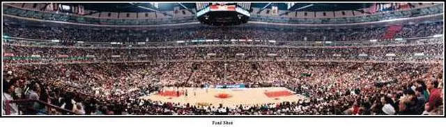 Friday, June 13, 1997. United Center, Chicago. Game 6 of the NBA Finals. Bulls lead the series 3 Games to 2, and lead the game 64-60 with 3:57 left in the third. Michael Jordan looks on, in the midst of another magnificent performance, as Dennis Rodman steps to the line. The air is thick with excitement - will the Bulls wrap it up tonight? How will it end? Will Rodman clunk another one off the rim? SNAP! The moment is captured for all-time, in glorious panoramic detail. With this poster, you are transported back to that amazing night in Chicago sports history, when the Bulls wrapped it up on a Steve Kerr jumper and claimed their fifth championship of the 1990s. Like all prints in photographer Rob Arra's Everlasting Images series, every single detail is in perfect focus, and as you pan across the image you feel like you are at the event. You can read the scoreboard, see see the banners in the rafters, faces in the crowd, and the action on the court. You can even pick out the faces of the broadcasters at courtside who called the game! For fans of the Bulls' dynasty run, this is the perfect, classy item to add to your wall and your collection.