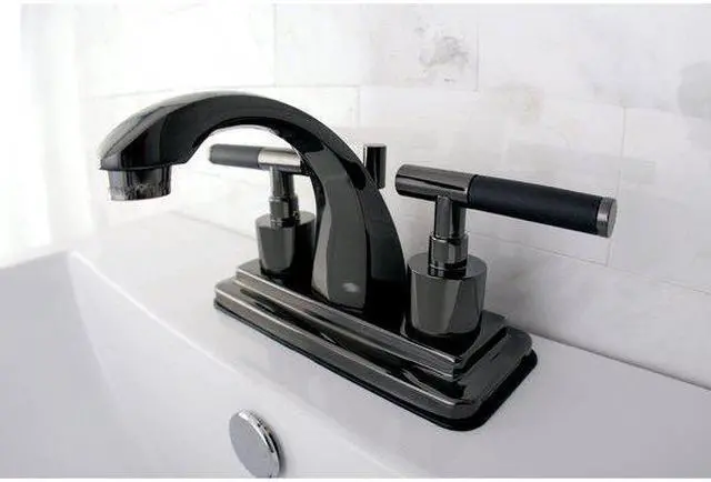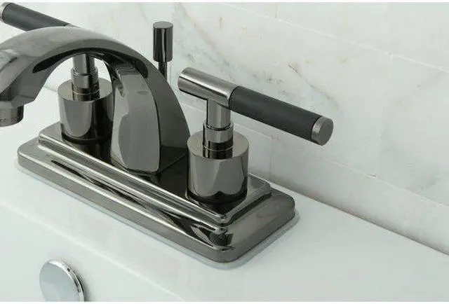 This 4 in. centerset lavatory faucet features smooth curves and wide estucheons in a thick cylindrical shape. The faucet is perfectly Water Ony's black nickel finish accented by Neoprene inserts, available in red, black and gray colors. This contemporary style faucet is made from solid brass for durability.